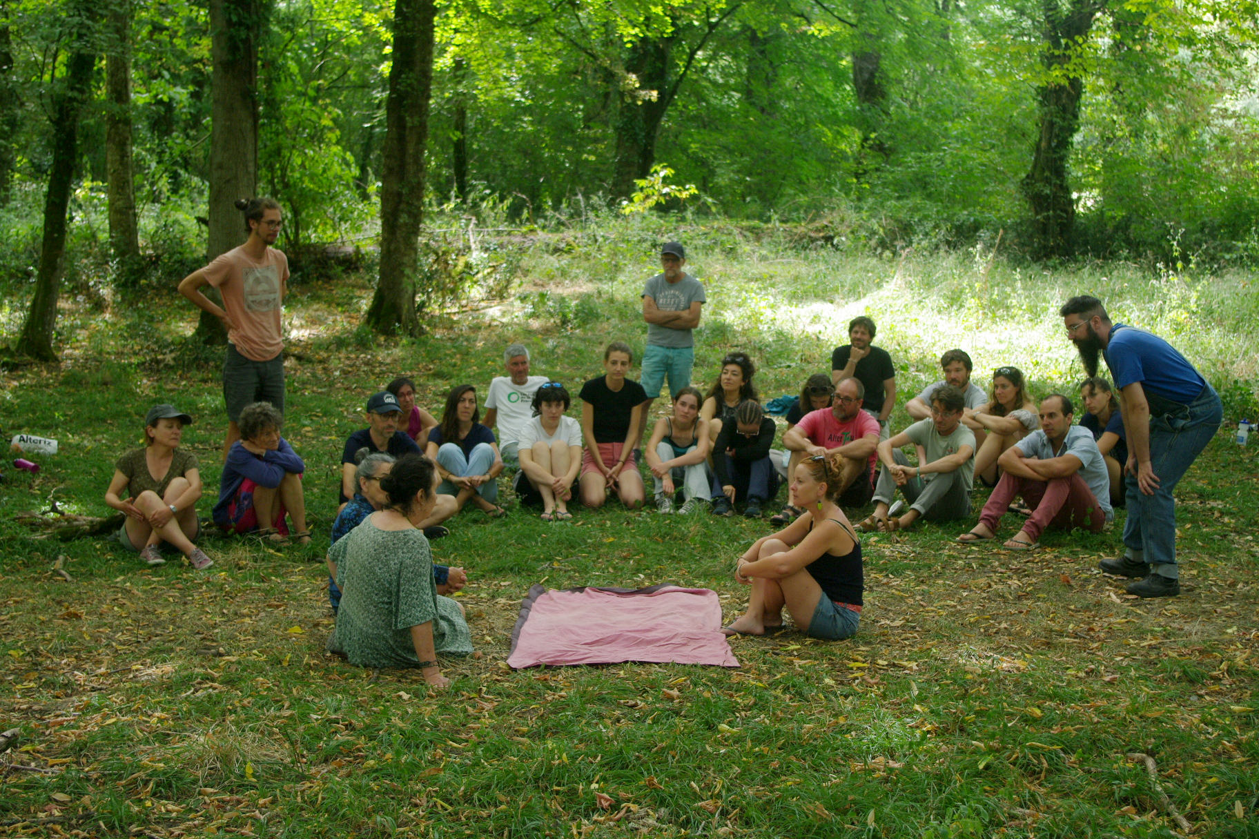 Au programme de ce jour, 2 ateliers de théâtre-forum se déroulent dans un bois situé dans l’enceinte du château. Le thème « comment faire pour changer les injustices auxquelles on se trouve confronté·e en tant que militant·es ».