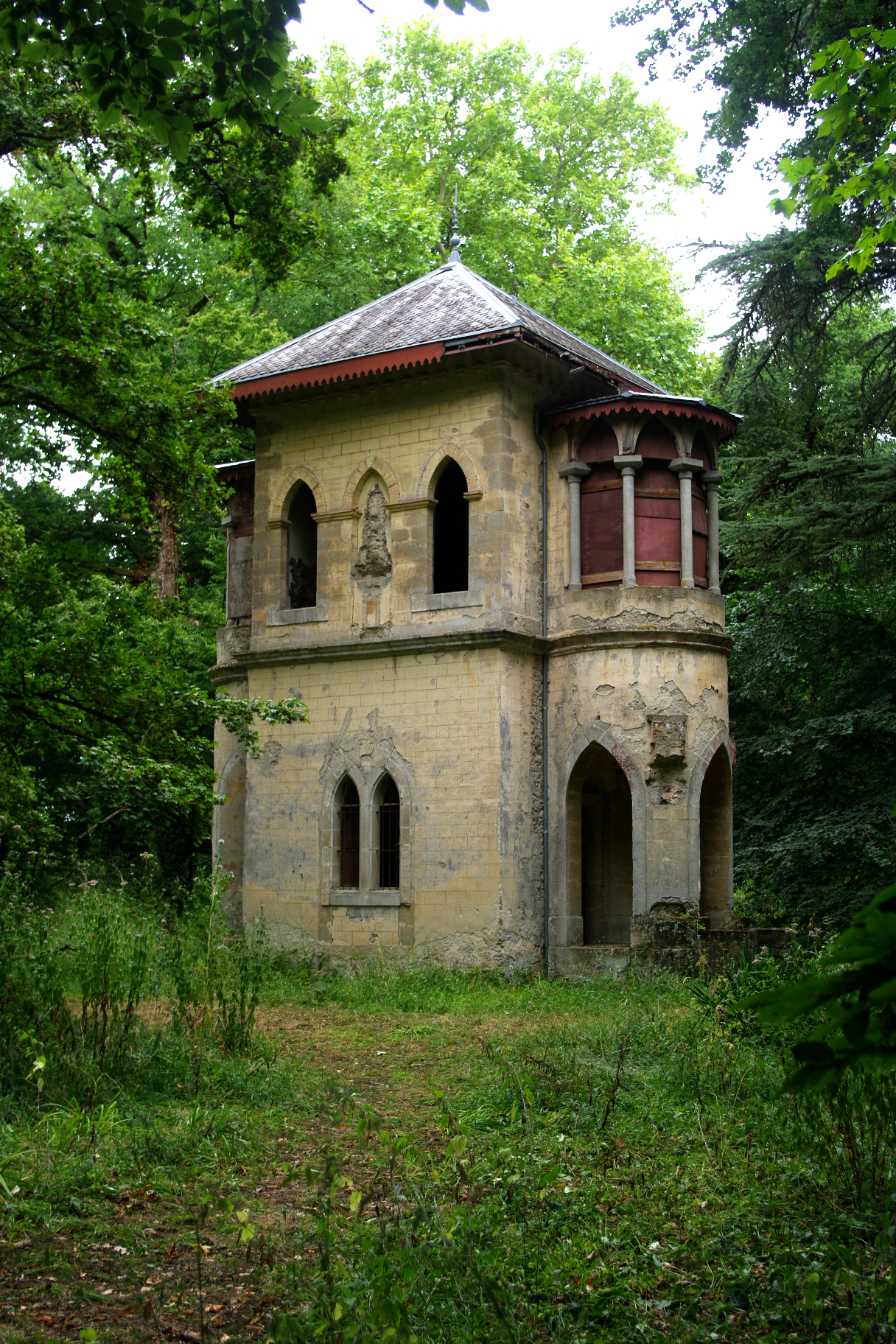 Avant de partir Bernard le propriétaire du château nous fait visiter le pavillon néo-gothique et romantique, dont l’escalier en colimaçon possède une visse centrale taillée dans une unique pièce de chène vieillie d’un siècle et demi. Nous n’entrerons pas dans les détails rocambolesque de la vie de ce monument historique victime comme le reste du domaine d’anciens propriétaires sans scrupule, parmi lesquels des élus, qui n’ont pas hésité à abattre pour des raisons pécuniaire de magnifiques chênes centenaires du parc. Sinistre écho du passé, rappelant le chantier écocide actuel, qui avait déjà value dans la presse ce titre de « Fourberie de Scopont ».