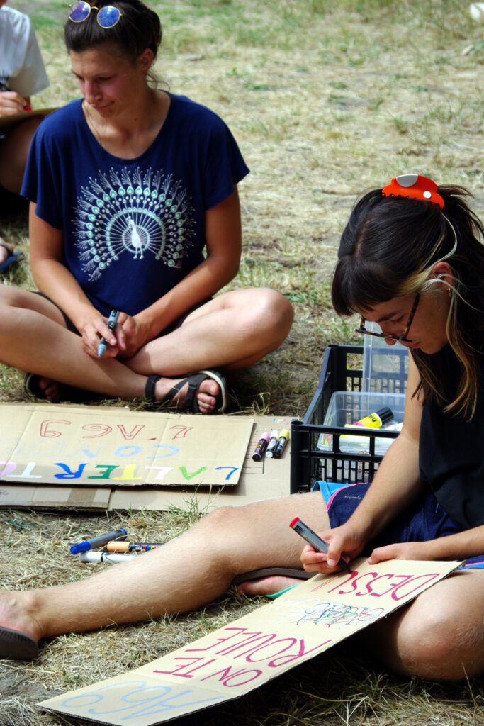 Laurent du collectif « la voie est libre » (pour plus d’info lvel.fr) nous accompagne dans la préparation d’une action symbolique de visibilisation et de soutien, planifiée en fin de journée devant une usine à bitume installée directement sur le chantier de l’A69.