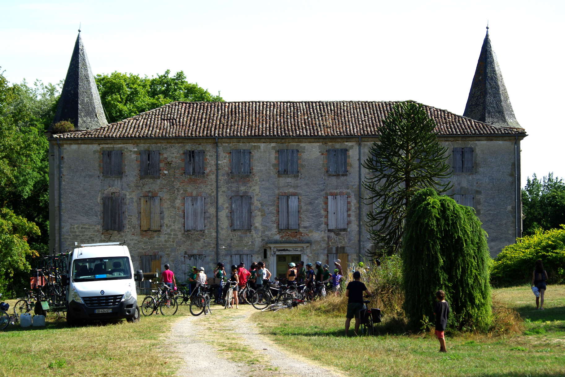 Nous nous réveillons au son des vas et viens très matinaux des engins de chantier de l’A69. Nous campons ici depuis hier soir au pied de cet étonnant château de Scopont. Transformé aux fil des époques, ses fondations datent du 13eme siècle.